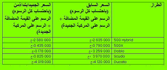 | الطراز | السعر السابق (باحتساب كل الرسوم) الرسم على القيمة المضافة + الرسم على المركبة الجديدة | السعر الجديد إبتداءًا من ( باحتساب كل الرسوم) الرسم على القيمة المضافة + الرسم على المركبة الجديدة |